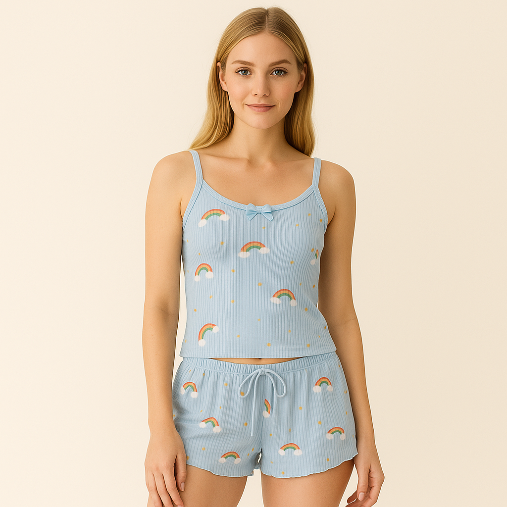 🌈 Estampa fofa e cheia de personalidade – com arco-íris, estrelinhas e nuvens em um fundo azul clarinho que transmite leveza e boas vibrações ✨